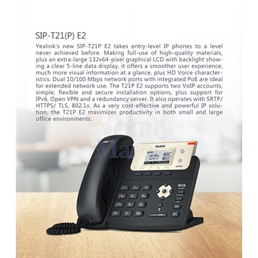 Le T21P prend en charge deux comptes SIP et des options d'installation simples, flexibles et sécurisées. Outre les normes IPv6, Open VPN, il fonctionne également avec SRTP / HTTPS / TLS, 802.1x. En tant que solution IP très économique, le T21P optimise la productivité dans les environnements de bureau de petite et moyenne taille.