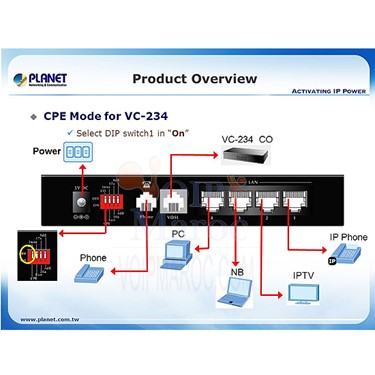 Le pont Ethernet-over-VDSL2 est livré avec une conception plug-and-play et est entièrement compatible avec tous les types de protocoles réseau. En outre, l'état de fonctionnement de chaque port individuel et de l'ensemble du système peut être visualisé via les voyants de diagnostic riches sur le panneau avant. Le VC-234 offre deux modes, CPE et CO , pour l'application: le mode CPE est utilisé côté client et le mode CO est côté central. Le mode CPE ou CO peut être réglé à l'aide d'un commutateur DIP intégré. Pour une connexion point à point, un mode CPE VC-234 et un mode CO VC-234 doivent être configurés comme une paire de convertisseurs pour effectuer la connexion.