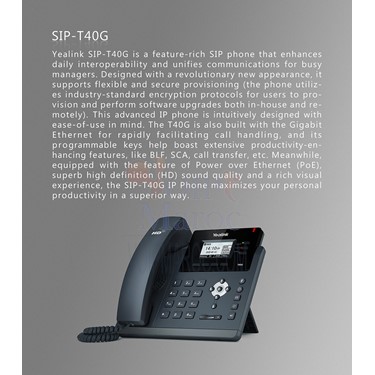 Le Yealink SIP-T40G est un téléphone IP complet mais rentable avec prise en charge du Gigabit Ethernet pour une vitesse d'avenir. SIP-T40G prend en charge le protocole SIP ouvert, vous offrant un choix maximal de plates-formes VoIP, y compris 3CX, BroadSoft, Genesys et Asterisk. Yealink T40G est conçu pour les utilisateurs ordinaires grâce à ses 3 comptes SIP et à son écran rétro-éclairé. Yealink inclut sa technologie audio Optima HD, qui fournit un son large bande à la fois depuis le combiné et le haut-parleur en duplex intégral. Connectez un casque à l'aide du port RJ9 dédié ou un casque EHS compatible à l'aide du port RJ12.Yealink SIP-T40G est conçu pour les bureaux d'aujourd'hui. Cela signifie que vous disposez de toutes les fonctionnalités de réseau et de sécurité dont vous avez besoin, y compris la prise en charge PoE pour simplifier votre infrastructure. Yealink SIP-T40G intègre également le contrôle 802.1p / Q QoS pour optimiser le trafic de données, le cryptage TLS pour protéger vos communications et IPv6 pour une compatibilité évolutive. La prise en charge Open VPN vous permet de recevoir et d’envoyer des communications via un réseau virtuel, assurant à la fois un son professionnel et une sécurité.Caractéristiques