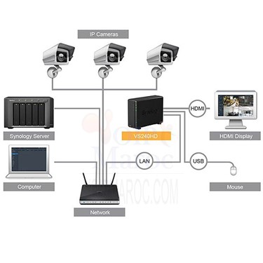 Le Synology VS240HD rend l'affichage en direct et la lecture de la surveillance simples. Connectez jusqu'à 24 caméras IP haute définition au VS240HD et associez-le à un serveur Synology pour un stockage et une récupération facile des images en seulement quelques clics. Avec une double prise en charge du HDMI, le VS240HD garantit une haute qualité d'affichage. En même temps, un affichage mural à écrans multiples est disponible pour les déploiements à grande échelle.