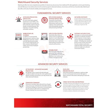 Transformez votre dispositif WatchGuard Firebox M200 Firewall en une solution unifiée complète de gestion des menaces avec la suite logicielle de sécurité SecurityGuard de WatchGuard. Cette suite d'un an de sécurité inclut des abonnements de sécurité UTM puissants qui renforcent les défenses dans les zones d'attaque critiques pour une protection réseau maximale. Valeur exceptionnelle, chaque suite comprend des abonnements à Application Control, à spamBlocker, à la défense de réputation, à WebBlocker, à un antivirus de passerelle et au service de prévention des intrusions, ainsi qu'au service LiveSecurity pour le support et la maintenanceCaractéristiques