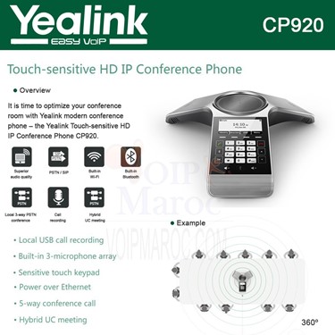 Son HD OptimaLe téléphone de conférence Yealink CP920 intègre la technologie HD Optima, le full duplex et l’annulation de l’écho acoustique. Les performances de communication sont optimales pour tous les utilisateurs qu’ils soient dans la salle ou à distance.Captation du son à 360°En intégrant trois microphones, le Yealink CP920 offre une prise de son à 360° et jusqu’à 3 mètres. Il est possible d’étendre la couverture en ajoutant deux micro supplémentaires.Conférence étendueLe Yealink CP920 gère des conversations accueillant jusqu’à cinq interlocuteurs. Ceci améliore significativement la communication entre des interlocuteurs situés dans différentes régions.Enregistrement des conversationsIl est très facile d’enregistrer les conférences téléphoniques en branchant tout simplement une clé USB sur le Yealink CP920.Connexion intégrée aux téléphones mobiles ou ordinateursIl est possible de connecter un téléphone mobile ou un ordinateur au CP920 pour partager la conférence téléphonique.DimensionsHauteur : 66,9mmLargeur : 307,8mmProfondeur : 298,5mmProtocoles VoIPSIP IP CentrexCodecsG.711a / μG.729aDHCPActivé (autoconfiguration IP)la communicationConférence à 5 interlocuteursRéseauEthernet 1 port RJ45 10/100 MbpsAlimentationPOE via RJ45 ou alimentation secteurConnectivité1 port USB 2.02 ports MIC EX (compatible avec le microphone Yealink CPE80)1 port téléphone mobile/PC : 3,5 mmDans votre colis1 téléphone Yealink CP9201 câble réseau Ethernet RJ45 compatible PoE de 7,5 m1 notice de démarrage rapide - Plus d'images (5)