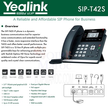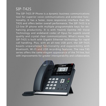 Téléphone IP design avec 6 touches programmables et écran LCD graphiqueLe téléphone Yealink T42S est un poste professionnel avec grand écran LCD graphique capable de gérer 3 comptes SIP. Sa particularité est de mettre à disposition 6 touches de fonctions paramétrables avec LEDs. Avec ses fonctions d'auto-provisionnement, d'auto-configuration et d'auto-actualisation, il convient aux entreprises recherchant un téléphone facilement manageable.Il s'adapte à votre environnementAvec le Yealink T42S, vous choisissez entre une alimentation PoE (via câble Ethernet) et une alimentation électrique classique (via bloc secteur - non-inclus).Gestion évoluée des appelsLe Yealink T42S offre les fonctionnalités de téléphonie suivante: identification du nom et du numéro de l'appelant, transfert d'appel, conférence à 3, communication interne...Ultra professionnelEquipé de la puce TI TITAN, d'un grand écran LCD graphique 2.7", de 6 touches programmables, d'un switch Ethernet 2 ports RJ45 10/100/1000 M, d'un port USB 2.0 et d'un mains libres full duplex, le Yealink T42S est idéal pour une utilisation intensive en entreprise.Compatible avec les environnements SIP:* Alcatel-Lucent* Aastra* Avaya* 3CX* Asterisk* SipleoCaractéristiques