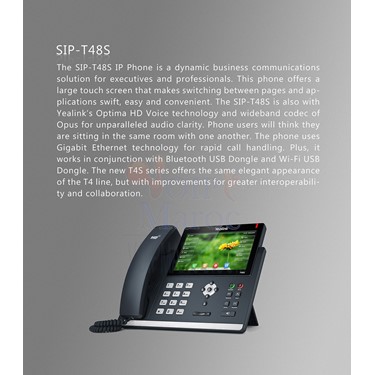 Téléphone IP design avec 10 touches programmables et écran LCD couleursLe Yealink T48S est le plus innovant de la gamme en constante évolution. Le téléphone IP Yealink T48S est spécialement conçu pour une utilisation locale et idéal pour les affaires internationales, l'industrie et le monde des affaires. Le Yealink T48S intègre un grand écran couleur 7 "800x480 pixels, qui facilitera le contrôle de ce téléphone SIP et où vous pouvez voir toutes les fonctions dont il dispose. Le fait qu'il soit tactile le rend d'autant plus attractif et complet, la prise en main est facile et intuitive.Et grâce à leur technologie optimale HD, il crée le sentiment que la personne à qui vous parlez est juste en face de vous, afin que vous faciliter grandement la communication. Le Yealink T48S fonctionne aussi avec Gigabit Ethernet ainsi que d'autres accessoires tels que USB Bluetooth Dongle et casque câblé et sans fil.Caractéristiques