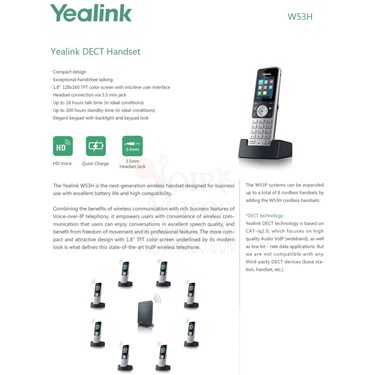 Le Yealink W53H est le combiné sans fil de nouvelle génération conçu pour une utilisation professionnelle avec une excellente autonomie de batterie et une compatibilité élevée. Combinant les avantages de la communication sans fil avec les fonctionnalités professionnelles riches de la téléphonie Voice-over-IP, il offre aux utilisateurs une commodité de communication sans fil leur permettant de profiter de conversations avec une excellente qualité vocale et de bénéficier de la liberté de mouvement et de ses fonctionnalités professionnelles. La conception plus compacte et attrayante de l’écran couleur 1,8 "TFT, souligné par son aspect moderne, est ce qui définit ce téléphone sans fil VoIP à la pointe de la technologie.Affichage