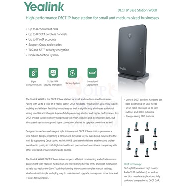 Base IP DECT prenant en charge jusqu'à 8 terminauxLe Yealink W60B est la station de base IP DECT pour les petites et moyennes entreprises. En combinant jusqu'à 8 combinés DECT Yealink, le W60B vous permet de bénéficier immédiatement d'une mobilité exceptionnelle et d'une flexibilité efficace, tout en éliminant de manière significative les problèmes de câblage et les charges supplémentaires. Cette station de base IP DECT prend en charge non seulement 8 comptes VoIP et 8 appels simultanés, mais accélère également le démarrage et la connexion des signaux, tout en réduisant considérablement les temps d'arrêt.Conçue dans un style moderne et élégant, cette station de base DECT IP compacte possède un design vous offrant un bureau ordonné. Il est même possible de fixer l'appareil au mur pour encore plus de place et de confort. En prenant en charge le codec Opus, le Yealink W60B offre une qualité audio excellente et professionnelle à la fois dans des conditions de bande passante élevée et de mauvaise qualité, en comparaison avec d'autres codecs audio large bande ou à bande étroite.La station de base Yealink W60B DECT IP prend en charge le provisioning efficace et le déploiement de masse sans effort grâce au mécanisme de redirection et de provisioning (RPS) et de démarrage de Yealink pour vous aider à réaliser le Zero Touch Provisioning sans aucun paramétrage manuel complexe et mise à niveau, en économisant encore plus de temps et de coûts informatiques pour les entreprises.La base DECT W60B s'intègre parfaitement dans n'importe quel bureau, que ce soit sur un bureau ou sur un mur. Avec une fente pour cordon d'alimentation encastrée, la W60B est petite et élégante comme une œuvre d'art finement conçue et s'intègre naturellement dans votre environnement de bureau sans ajouter d'encombrement.Petit mais puissant, le socle DECT W60B a été amélioré pour offrir des fonctionnalités puissantes, fiables et évolutives.caractéristiques du produit