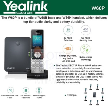 Pack DECT IP comprenant la base et son terminalLe pack Yealink DECT IP W60 améliore la productivité des employés constamment en déplacement ainsi que leurs communications, dans des secteurs tels que le stockage, la restauration et le commerce de détail, ainsi que dans les usines. Petite mais puissante, la base DECT W60B est optimisé pour assurer une plus grande fiabilité et évolutivité. Le W60P est un pack qui comprend une base et un téléphone qui offre une clarté audio de première classe et une longue durée de vie de la batterie. C'est une solution téléphonique DECT idéale pour les salariés ayant besoin de circuler dans les locaux de l'entreprise.La base Yealink W60B DECT combine la facilité d'utilisation et l'évolutivité et dispose d'une mise à jour pilote pour des fonctionnalités améliorées telles que le support de 8 terminaux, 8 comptes SIP et 8 appels vocaux simultanés maximum. Ce périphérique puissant permet une plus grande évolutivité pour votre collaboration vocale.Quant à la batterie, elle dispose d'une batterie lithium-ion avancée, le pack W60P a la capacité de tenir jusqu'à 30 heures de conversation et 16 jours (400 heures) en veille. Le téléphone DECT offre aux entreprises une solution durable grâce à sa technologie de charge rapide et sa batterie robuste.Son design est compact et élégant. La base s'adapte très bien à n'importe quel bureau et il est même possible de fixer le téléphone au mur. Quant au téléphone, il dispose d'un écran couleur de 2,4 pouces et combine les couleurs noir et argent.Caractéristiques